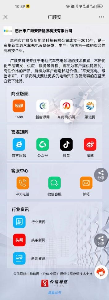 广顺安此次启用公信导航-购物版,不仅进一步整合了公司的官方商城、微信公众号、抖音号、微博及客服中心、行业资讯等公司信息,还直接链接到公司官方网站,为用户提供了全方位的信息服务。用户只需通过手机扫描公信导航码,或在移动端浏览器地址栏输入中文域名“广顺安新能源.购物”,即可轻松访问该页面,实现一键访问、关注、分享。这不仅提升了用户体验,也加强了广顺安与消费者之间的互动与联系。