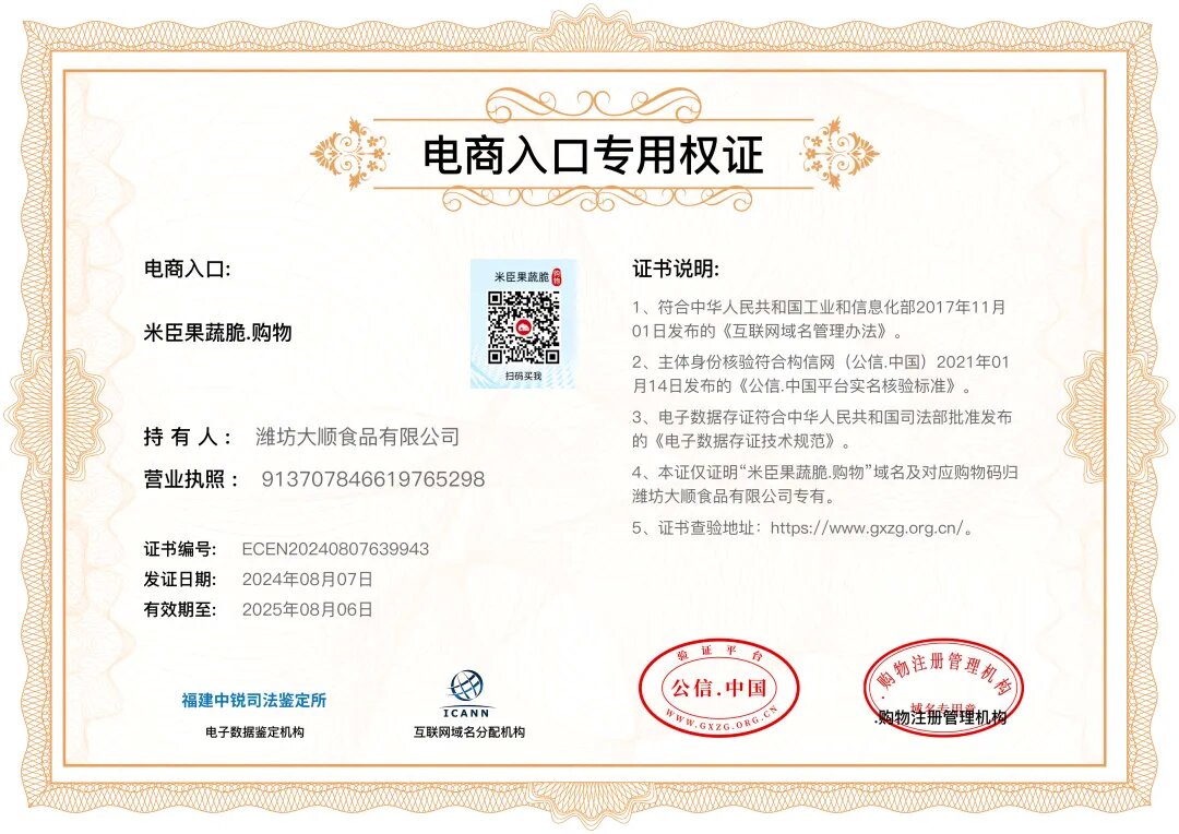 潍坊大顺食品有限公司(简称“大顺食品”)作为食品行业翘楚,为持续增强消费者满意度与品牌信任度,旗下核心品牌“米臣果蔬脆”正式启用公信导航,并申领电商入口专用权证。依托公信导航的权威认证与“米臣果蔬脆.购物”电商购物入口的便捷通道,大顺食品稳健推进品牌线上营销,深化品牌市场布局,不仅显著提升了用户的访问体验,更有效地实现了流量的精准汇集,成为企业网上品牌营销的关键入口,进一步巩固并提升品牌影响力。