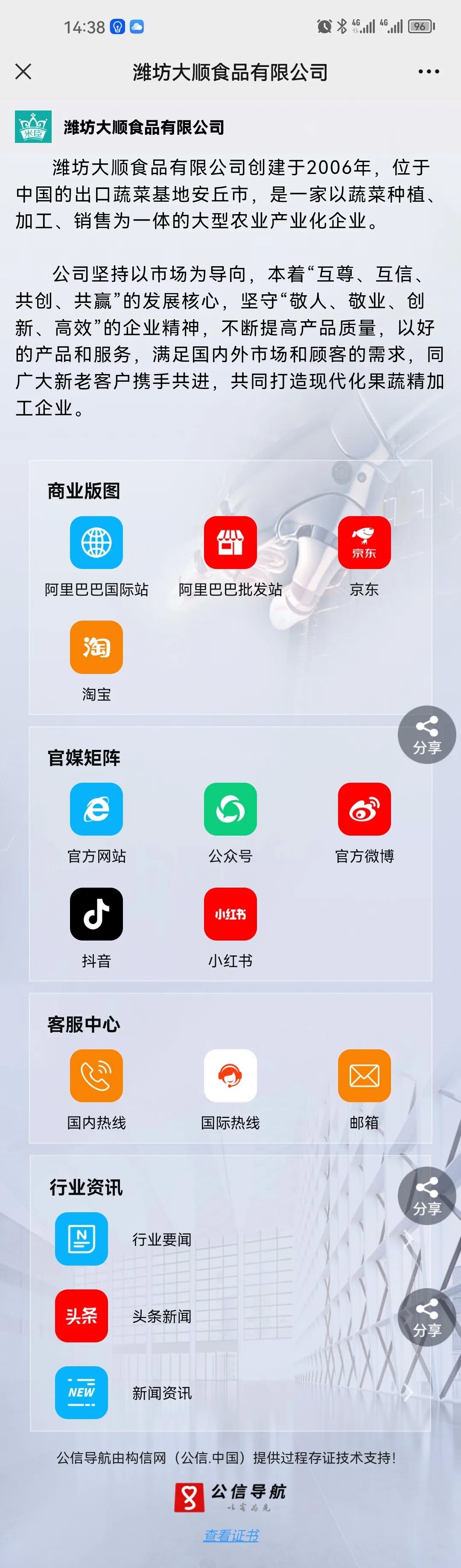 在数字化时代,大顺食品积极拥抱变革,携手公信导航服务,不仅向广大客户提供了可信的导航服务,也体现了大顺食品对用户信任感的重视,通过技术创新和优质服务,为用户创造更加安全、便捷、高效的品牌营销体验,充分发挥行业领跑作用,在提高产品质量的同时,不断响应国内外市场和客户的需求,积极向一流的现代化果蔬精加工龙头企业迈进。